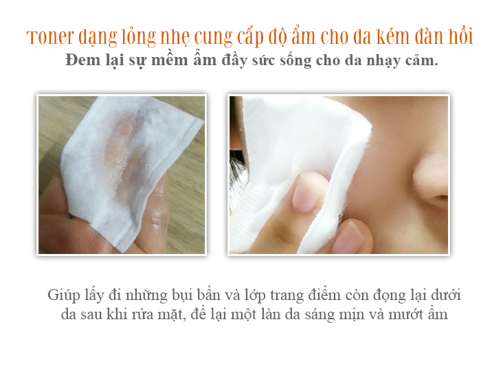 Sản phẩm dạng nước tươi mát có cấu trúc nhẹ mà không gây nhờn rít. Toner dạng lỏng nhẹ cung cấp độ ẩm cho da yếu, da tiếp xúc với nhiều bụi bẩn, da dầu hay da kém đàn hồi và đồng thời đem lại sự mềm ẩm đầy sức sống cho da nhạy cảm. Giúp lấy đi những bụi bẩn và lớp trang điểm còn đọng lại dưới da sau khi rửa mặt, để lại một làn da sáng mịn và mướt ẩm.